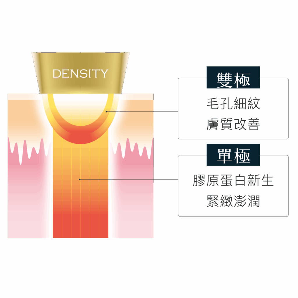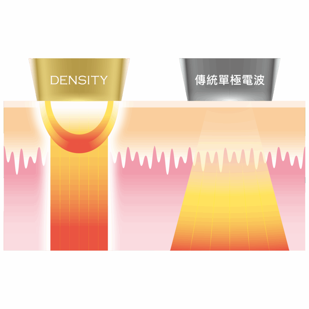 適當的冷卻可幫助體積式加熱更均勻穩定。每次脈衝Density提供三階七段冷卻:二段在脈衝前預冷、三段在脈衝間、二段在脈衝後冷卻。即時溫度偵測,表皮高於特地溫度,自動噴發冷媒降溫。