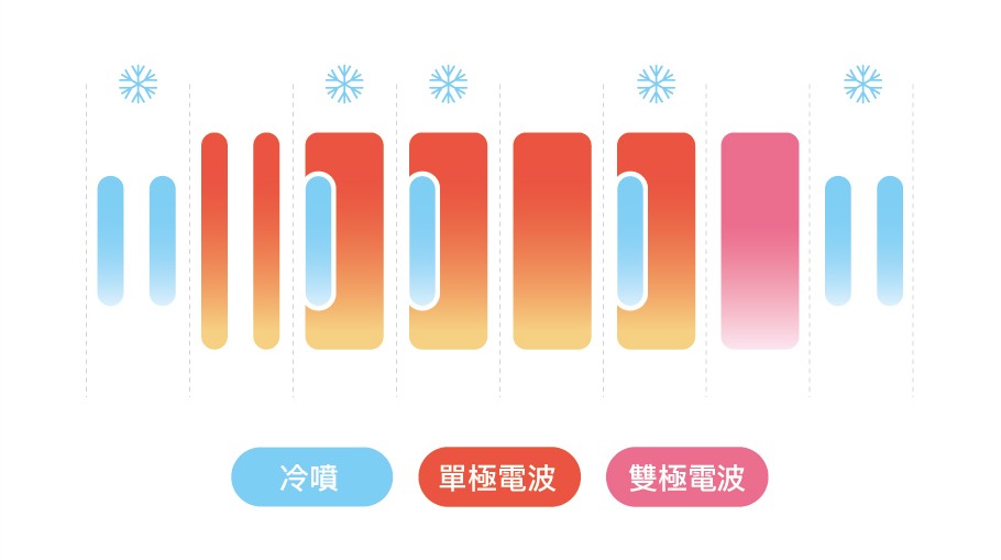 每次擊發僅有單極電波能量,其電流方向的不確定性,能量容易分散,提高功率的同時增加皮膚負擔。