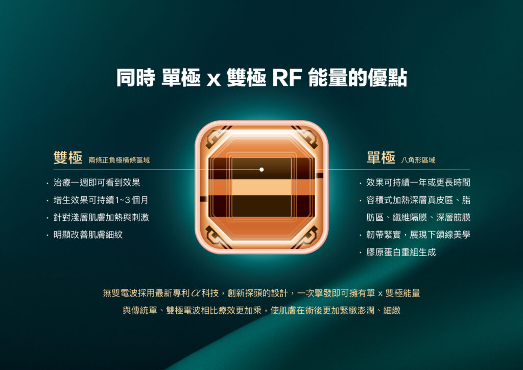 採用專利 α 科技,單次擊發同時提供單極與雙極能量,針對真皮淺層(乳突層、網狀層)及深層加熱,促進膠原蛋白重組新生,使肌膚恢復緊緻與彈性。